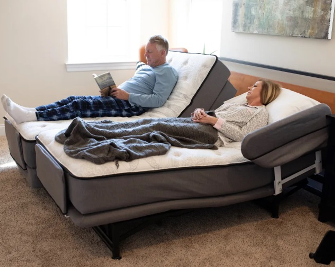 The Dual King Adjustable Bed is usually recommended for two people because EACH Person gets their own hand control The Dual King 76" x 80" is a standard Eastern size King-Size Beds. (It is 6" wider, and 4" less long than a one-piece CALIFORNIA King). Most people purchase the standard 76" x 80". (Which is the same as buying TWO Twin Extra Longs side by side.) Whether you buy a Twin Regular (38" x 74"), Twin Extra Long (38" x 80") or Twin California King Length (38" x 84") or 36" x 84" (1/2 of a California King, 72" x 84") - the bending in the middle is the same (the factory just adds the extra lengths at the very top and bottom). We recommend the 84" if the husband is over 6'1" tall. If you are between sizes, again, we ask you if you have longer legs than normal, or if you tuck in your sheets by your feet - if you answer yes to either questions, we usually recommend the longer length. Finding bottom fitted sheets for each side, 38" x 84" or 36" x 84" are available through Electropedic Comes in your choice of three sizes: Some people choose a specific King Size when they want to save their existing headboard and footboard sets. |